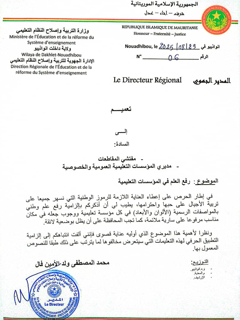 لوحت الإدارة الجهوية للتهذيب بداخلت نواذيبو باتخاذ عقوبات صارمة لأي مؤسسة لاتحترم العلم الوطني.