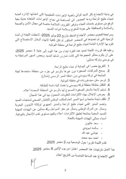 7- تكلف لجنة متابعة يرأسها المدير العام لمكتب تفتيش منتجات الصيد وعضو المدير الفني لميناء خليج الراحة والمدير الجهوي لوكالة الشوؤن البحرية وممثلين عن الدرك وخفر السواحل و4 من ممثلي المنظمات النقابية للصيد بمتابعة تطبيق الإلتزامات ،وتقييم مستوى تقدم الأشغال ب"البونيته"