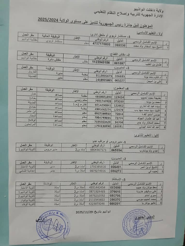 يتساءل الكثير من المتابعين للشأن التربوي عن السر الحقيقي في عدم تكريم أول مديرة لمؤسسة تعليم ثانوي بمدينة نواذيبو خديجة بنت أبوبكر التي خدمت في قطاع التعليم أزيد من 30 عاما.